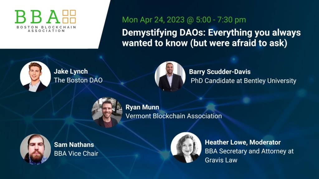 You know those people you hear and see but have yet to learn what they do. Well, a Decentralized Autonomous Organization (DAO) has that mystery. And the Boston Blockchain Association (BBA) aimed to demystify DAOs by sharing everything you always wanted to know but were afraid to ask.